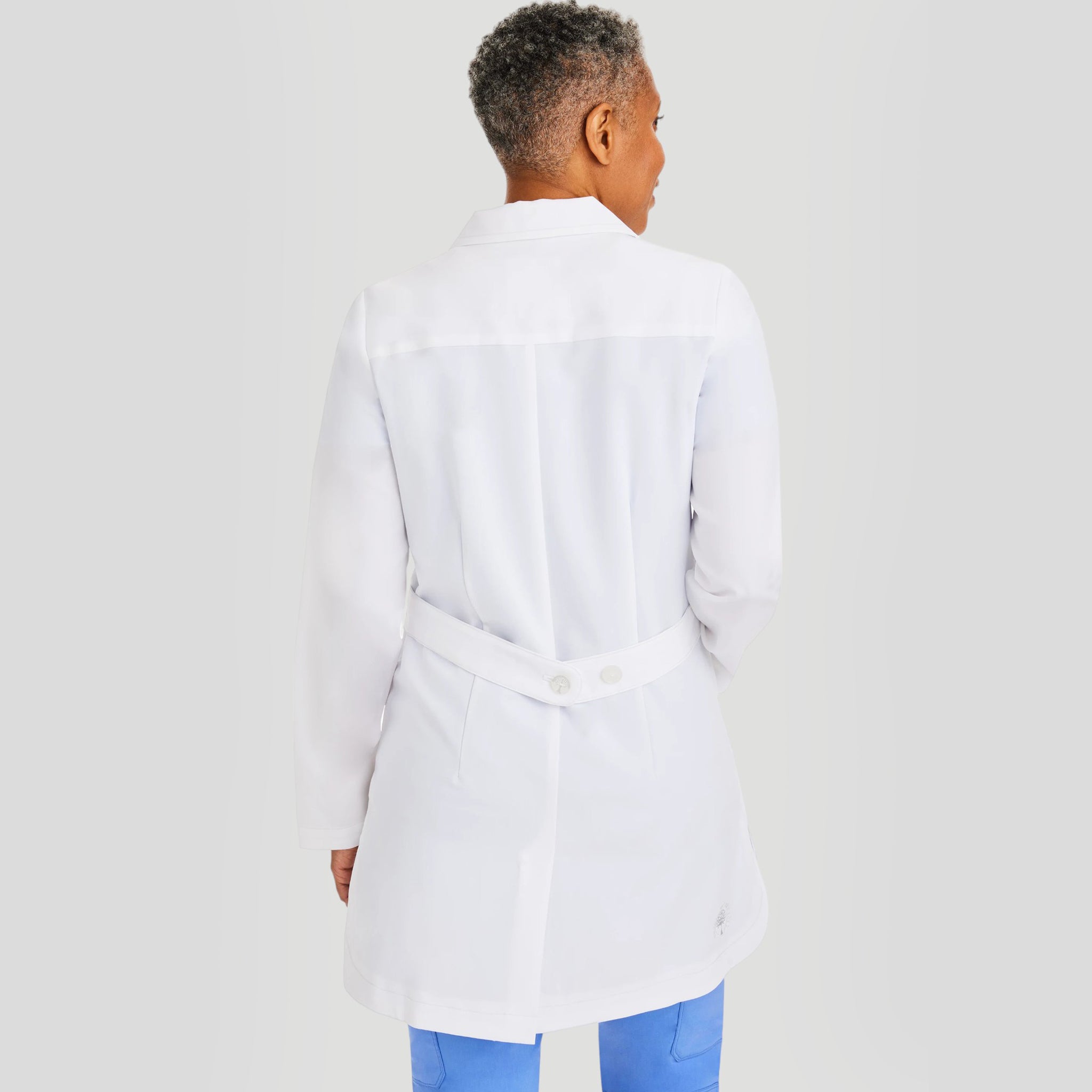 Fiona lab coat has a feminine rounded lapel with a princess dart for a better fit. It has 3 pockets with cell phone pocket. There is a back vent and an adjustable back belt.